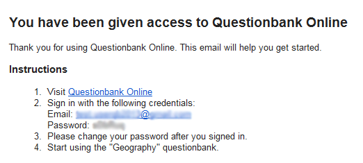 Once your coordinator sets up a login for you, you will receive an automated email (shown below) with instructions for signing into the online Questionbank for the first time.