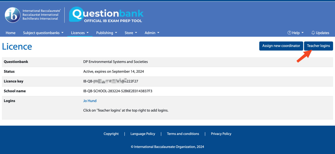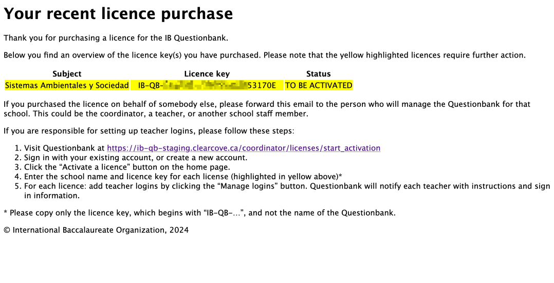 If you bulk purchased licences for multiple schools, please forward the instructions and licenses to the person who will manage the Questionbank for each school. This could be the Diploma Programme coordinator, a teacher or another school staff member.