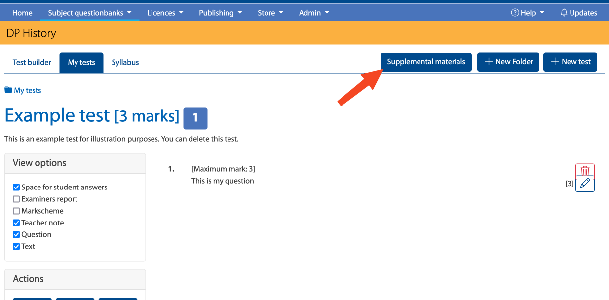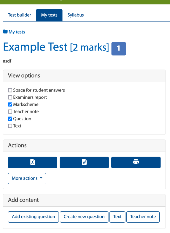 On the Test dashboard you can manage how you want your test to look like and export it to PDF and Word. Do you want to include student answer space, or only the markschemes and examiner comments, you can edit these options here on the Test dashboard. From here you can also add questions from the Questionbank library or create your own questions.